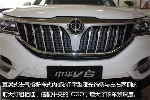 外观方面,中华V6采用了华晨中华最新的设计语言,新车前脸采用了全新的直瀑式进气格栅样式,其格栅内部的T字型哑光饰条与左右两侧的前大灯组相连,搭配中央的品牌LOGO,使该车辨识度大大增加。而位于车头下方的雾灯组造型别致,搭配细长的前进气口,使整车看起来更加犀利。