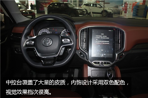 内饰设计部分,新车车内采用了双色配色,看上去很上档次。如同车身外观一样,新车车内也采用了大量的折线设计,营造出运动、立体的一面。内饰设计风格与V3近乎相同,但在材质上较V3有较大幅度的提升,皮质材料,镀铬装饰、普通塑料,多材质合成的内饰对审美也是一种挑战。