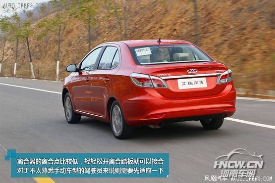 艾瑞泽3离合器的离合点比较低,轻轻松开离合踏板就可以接合,对于不太熟悉手动车型的驾驶员来说则需要先适应一下,不过当堵车需要频繁踩下离合器踏板时就会比较省力。油门与刹车踏板的响应算是不紧不慢,油门的脚感上它并不会让你有慵懒的感觉,只要你轻点油门踏板,车辆便有较快的反应。刹车制动的表现谈不上很灵敏,但制动力的释放过程比较均匀、线性,还是能给予驾驶员一定的信心。
