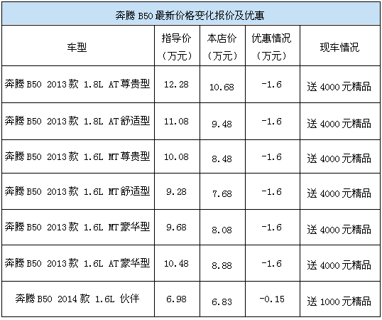 河南车网讯:近日,编辑从一汽奔腾洛阳亿众汽车销售服务有限公司了解到,目前店内奔腾B50最高优惠1.6万元,送4000元精品,奔腾B50伙伴来电有优惠送礼包,感兴趣的朋友请致电经销商或到店详询。具体详情请看下表:
