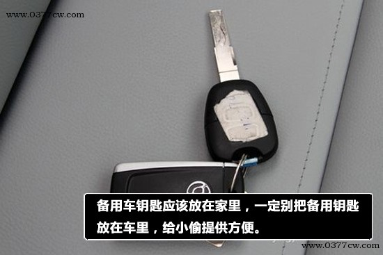 2、一般车钥匙都有备用的,您一定想着别把备用钥匙放在车里,不管是车内什么地方,盗贼都会找到。这一点您可不要麻痹大意。