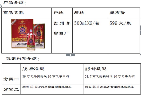 奥迪A6标准型,36万/台,每台赠送10万元茅台