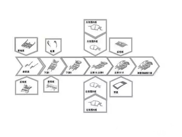 下面这张图大概说明了车身的制造流程,可以看看上面说的下部/侧围都是什么。