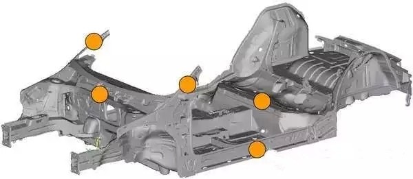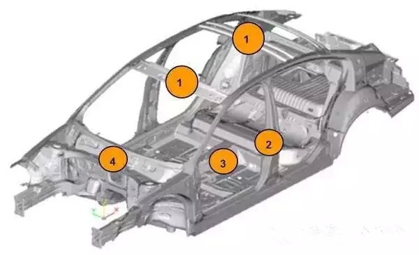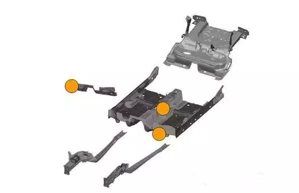 标黄的地方都是使用了超高强度钢板的部位。