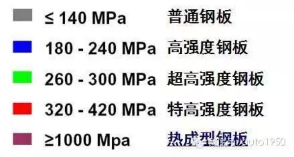这张图就说明了白车身骨架中主要使用超高强度(热成型钢板)的位置,图里未展示车门防撞梁和前后防撞梁。此图不包括四门/两盖/翼子板/侧围外板/顶盖等外表面件,一般消费者所说的钢板厚度都说的是这些外表面件的钢板厚度,其实车身安全和外表面件的钢板厚度一点关系都没有,只和车身的结构及关键部位板材/连接强度有关。