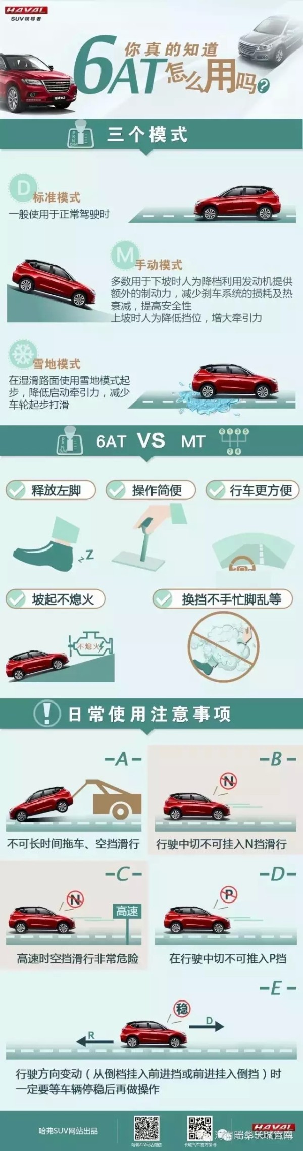 哈弗H2自动挡车型的推出,可以大大拓展该车的使用人群,免去了“动手动脚”的麻烦,给驾驶者带来更多便利,不过自动挡变速器的使用也有一些小技巧和注意事项,一张图带您详细了解如何正确使用哈弗H2的6AT。