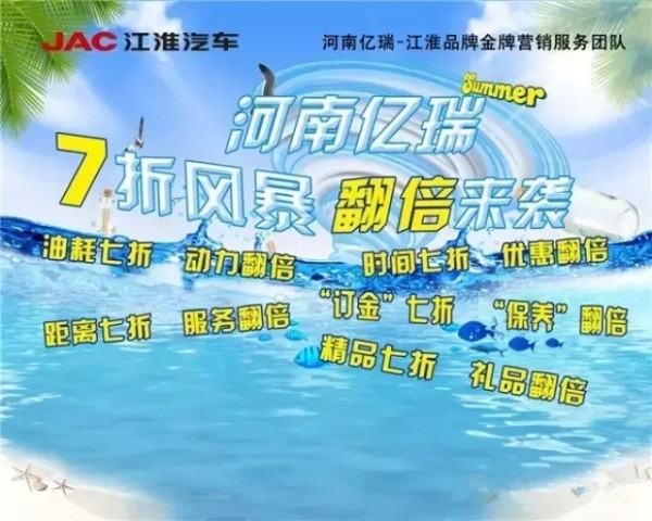 拒绝年中不震撼钜惠,江淮汽车河南亿瑞4S店联合各大媒体共同推出——“7折风暴 翻倍来袭”。从2015年7月1日起,河南亿瑞连续推出瑞风S5热销车型,油耗、时间、距离、订金、精品都是7折!服务、保养、礼品更是翻倍!