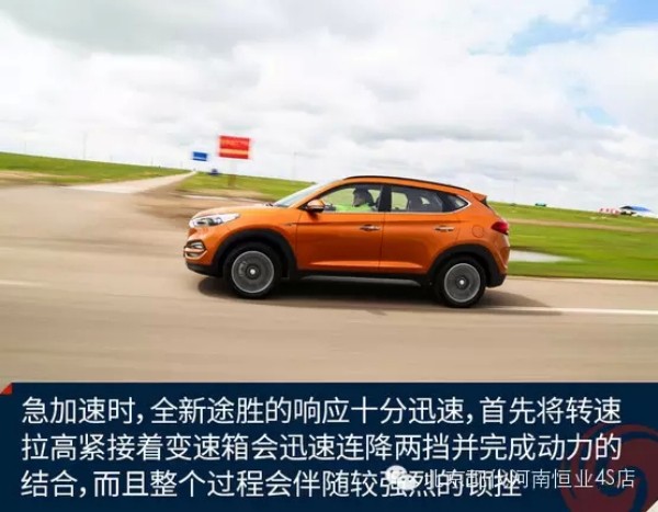 缓慢的加速时,变速器的换挡比较平顺,即使是刚起步时的蠕行状态也不存在反应慢或者是顿挫的状态。当急加速时,你会觉得全新途胜的响应十分迅速,而这样的感觉是源自全新途胜十分聪明的换挡逻辑设定,他会首先将转速拉高从声音上体现出车辆加速的状态,但是实际上这个时候身体上并不会有任何加速的感觉,但紧接着变速箱会迅速连降两挡并完成动力的结合,而且整个过程会伴随较强烈的顿挫,对于喜欢驾驶的人来说这个感觉还算能接受。