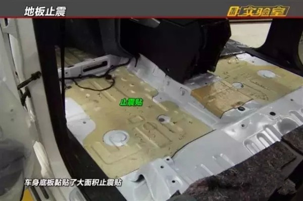 驭胜S350的地板防护也采用了当下主流的形式,表层有地毡覆盖,地毡背面为防潮层。防潮层下面布置了再生材料的吸音棉。车身底板黏贴了大面积的止震贴。