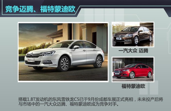 东风雪铁龙为C5换搭1.8T涡轮增压引擎后,其动力将更为强劲。新C5上市后将与同级别市场中的迈腾和蒙迪欧进行竞争。目前,现款搭载2.3L发动机的雪铁龙C5动力上已显疲态,影响了竞争力,随着东风雪铁龙为C5换搭1.8T涡轮增压引擎,这种局面将有所改变。