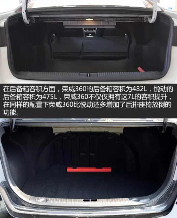 在后备箱容积方面,荣威360的后备箱容积为482L,悦动的后备箱容积为475L,荣威360不仅仅拥有这7L的容积提升,在同样的配置下荣威360比悦动还多增加了后排座椅放倒的功能,从空间扩展方面又赢得了新的领先。