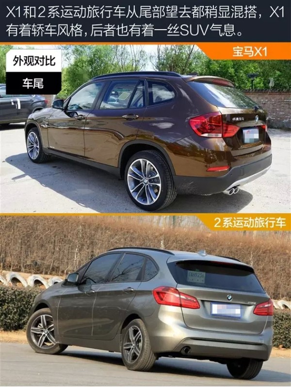 宝马X1的外观更加修长,车身尺寸更占优势;2系运动旅行车则稍显拘谨,略带憨态。X1虽然为SUV车型但略低矮的车身还是让人会将其和轿车联想起来;2系运动旅行车则凭借顶部的行李架和较高的车身高度与普通紧凑级车区分开来。