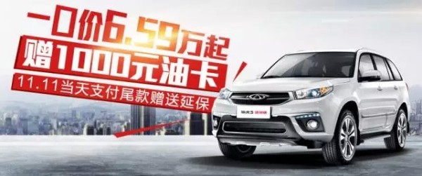所有成功在奇瑞天猫旗舰店购得瑞虎3一口价车型宝贝的消费者,均可获赠价值2000元的延保产品(重要零部件1年或2万公里)、6599~6999点天猫积分(视车型一口价不同而不同),还有价值800~1300元的油卡礼包!早定早得、早定多得!既然抢先送,当然不能只有这一款车型即日起至11月11日登陆天猫、拍拍两大平台的奇瑞官方旗舰店,瑞虎5 (2.0)、瑞虎3、艾瑞泽3、艾瑞泽7、艾瑞泽M7只要你购车统统可得1000元现金抵扣。亦可在11月20日前登陆易车分会场,不仅以上车型直降1000元还有机会获得易车网额外补贴油卡。