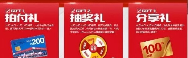 第三重豪礼为“分享礼”。双十一活动期间,实现成功购车的客户,将购车体验晒单至微信朋友圈、汽车之家和易车论坛,可获得分享奖,即可获得100元话费。