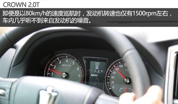 从驾驶感受来看,2.0T版的皇冠依然保持着静逸、平顺的特质。尝试温和起步,其过程非常平稳。油门踏板的初段的调校非常温和,整个过程就像一辆磁悬浮列车缓缓驶出月台。虽然这台皇冠已经没有了V6发动机的护航,但低速时的平顺性和静逸程度几乎与V6版本一模一样。