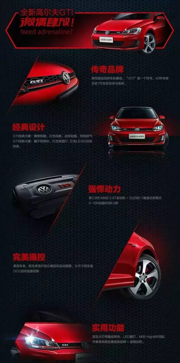 配置方面,国产全新高尔夫GTI将标配双氙气大灯、U形LED日间行车灯、AFS随动转向功能、17英寸战斧铝合金轮毂、225/45 R17轮胎、全景天窗、无钥匙进入、一键启动、黑色Vienna真皮运动座椅、座椅加热、12向电动调节、6.5英寸液晶屏、MIB信息娱乐系统、电子手刹、AUTOHOLD自动驻车、XDS动态电子差速锁、MKE疲劳提醒系统、定速巡航系统、胎压监测系统、8探头倒车雷达、DCC动态底盘控制系统、驾驶模式选择等。