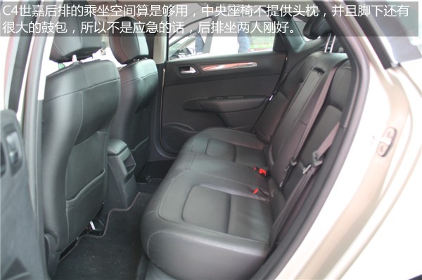 后排的乘坐空间算是够用,中央座椅不提供头枕,并且脚下还有很大的鼓包,所以不是应急的话,后排坐两人刚好。