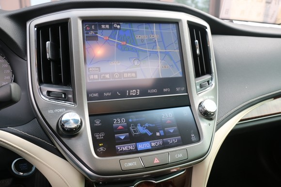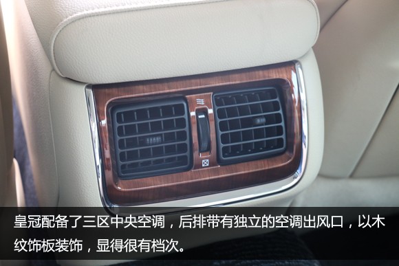 皇冠配备了三区中央空调,后排带有独立的空调出风口,以木纹饰板装饰,显得很有档次。另外,在后排的侧上方和顶部均也配有出风口,这些让后排的舒适性达到了很高的程度。