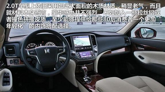 内饰上,2.0T新皇冠没有任何变化,而且同样提供深浅两种配色,不过我个人认为,2.0T车型上依旧采用如此大面积的木质材质,稍显老气,而且就材料本身而言,豪华感也并不强烈。不如加入一些拉丝铝或者撞色拼接皮质,至少能够提供给那些80后消费者一个更加“年轻化”的内饰搭配选择。