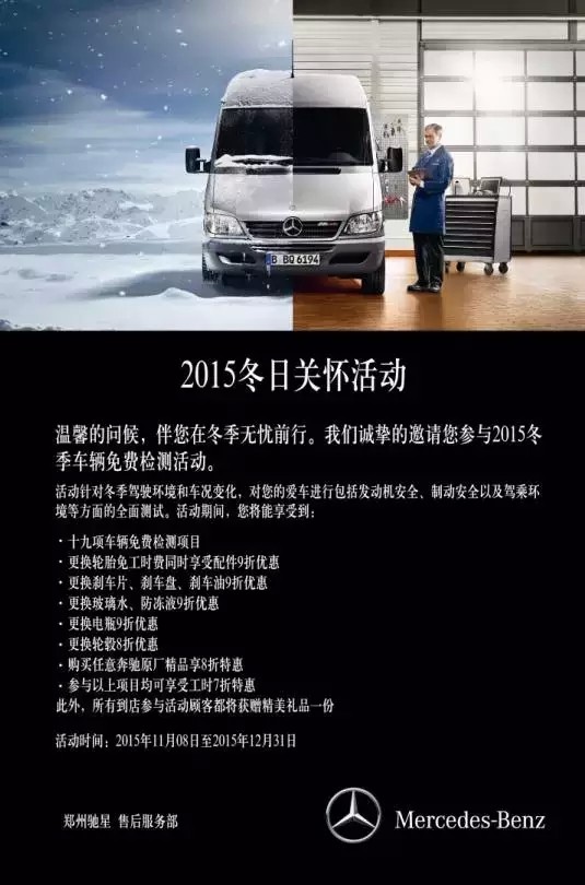 2015年接近尾声,郑州驰星温情问候,在繁忙的工作节奏和生活步调下,记得照顾好自己的身体,也不要忘记您的爱车也需要细心呵护。本日起至31日,为了感谢老顾客们一直以来的支持与关注,郑州驰星售后冬季关怀为您送上多重好礼。