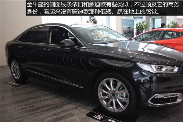 金牛座的侧面线条依旧和蒙迪欧有些类似,不过顾及它的商务身份,看起来没有蒙迪欧那种低矮、趴在地上的感觉。