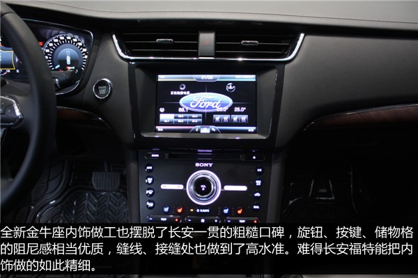 金牛座的内饰设计与外形呼应到位,整体内饰线条平直,按键、旋钮等设计简洁,没有过多的木纹装饰,虽与奢华沾不上太大的边,但豪华、价值感还是有的。内饰的用料非常大方,大面积皮革包裹,并且门内把手与中控扶手,似乎都加宽加厚了。内饰做工也摆脱了长安一贯的粗糙口碑,旋钮、按键、储物格的阻尼感相当优质,缝线、接缝处也做到了高水准。难得长安福特能把内饰做的如此精细。
