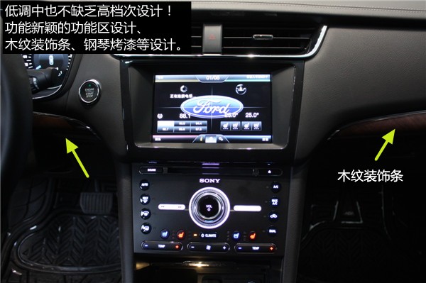 内饰与外观风格相一致,简洁大气,低调中也不缺乏高档次设计,如功能新颖的功能区设计、木纹装饰条、钢琴烤漆等设计。