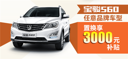 “家用大SUV”宝骏560也在优惠之列,这款SUV市场最火爆的产品,上市之初可谓“一车难求”,上市第三个月就在厮杀激烈的SUV市场冲至第二位。此次钜惠可谓喜上加喜,自3月1日起,凡以任意品牌旧车置换购买宝骏560的消费者,将享受3000元补贴。让宝骏560的“性价比”再创新高!