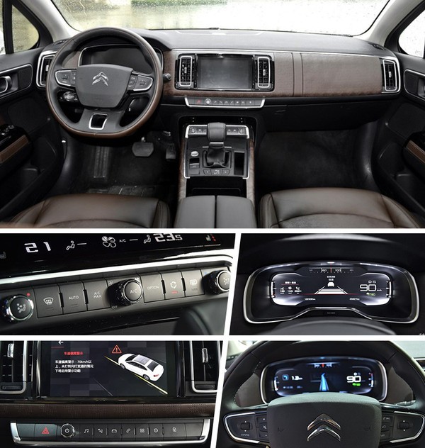 内饰方面,雪铁龙C6整体显得规整沉稳,采用四辐式设计方向盘,矩形出风口和中控台表面用以软材质包裹,使用天然纹理实木饰板并采用NAPPA头层牛皮更显高档。同时新车配备12.3英寸全液晶仪表盘,点亮后科技感十足。此外还装配全景天窗、大尺寸中控液晶显示屏与带负离子发生器的四区独立空调。