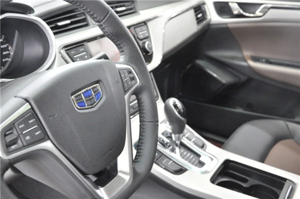 帝豪GL简约大方,不失豪华感。帝豪GL的车内采用航空环绕一体座舱设计,中控台的设计灵感来自中国传统拱桥的弧线,整体风格简约大气,富有亲和力。整个中控台采用搪塑软性材质包裹,做工实在触感不错。平底三幅式多功能方向盘带有些许运动味道,半打孔的皮质包裹手感不错,哑光金属饰条的搭配恰到好处,提升了精致感。仪表盘采用连通双炮筒式设计,中央的3.5英寸TFT高清显示屏带有动画效果,显示的数据非常丰富。8英寸的彩色显示屏分辨率为1280×720像素,包含的功能非常丰富,触感及反应灵敏度都还不错。