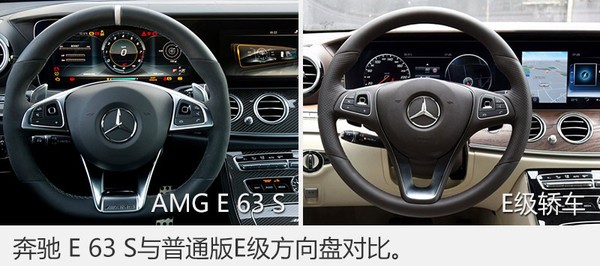 在初次摸到这台E 63 S的时候,首先能触及到的就是它的方向盘了。为什么这么说,因为它的样式不经让我想起了之前试驾会中体验的普通版奔驰E级轿车。当我摸到AMG E 63 S上这个方向盘,个人觉得这台车的方向盘更加有握感,并且开起来路感更加自然,似乎能直接感觉到前轮的方位。
