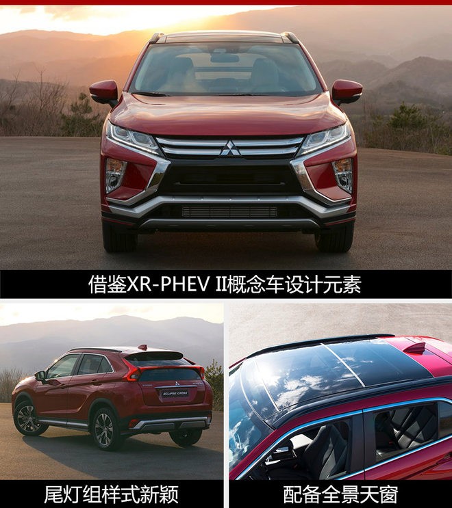 Eclipse Cross定位于紧凑型SUV,长宽高分别为4405*1805*1685毫米,轴距为2670毫米。新车外观方面采用了全新样式的“X”形前脸设计,进气格栅与两侧LED头灯组相连,灯组内部配备LED日间行车灯。此外,相较于车头,Eclipse Cross的尾部设计更加个性,尾灯组将后风挡玻璃一分为二,样式十分新颖。