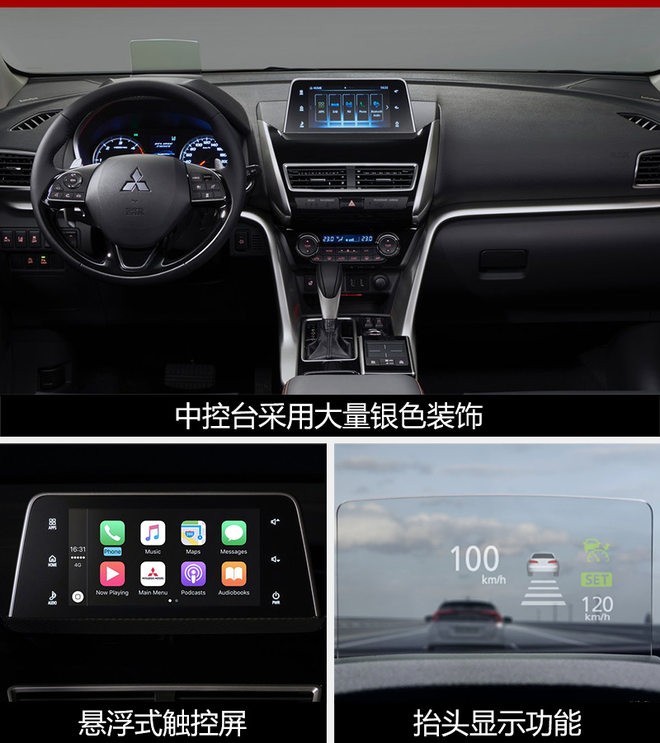内饰方面,Eclipse Cross中控台设计层次感较强,大量银色装饰的运用使其更具活力。中控台中央的大尺寸悬浮式触控屏支持苹果CarPlay和安卓Auto系统。配置方面,新车提供双温区自动空调、座椅加热、电子手刹、自动驻车、抬头显示等功能。