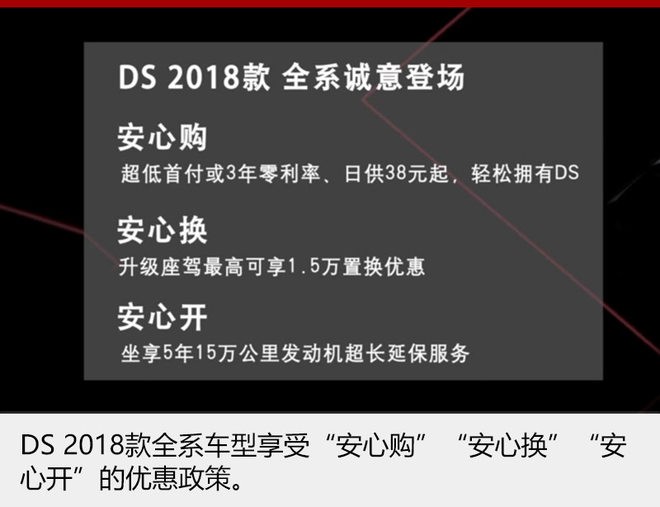 另外,DS还同步推出了客户关怀政策:1、安心购,超低首付或3年零利率、日供38元起,轻松拥有DS;2、安心换,升级座驾最高可享1.5万置换优惠;3、安心开,新老客户畅享5年15万公里发动机超长延保服务。(延保受理自2017年10月23日起,截止到2017年12月31日前。)