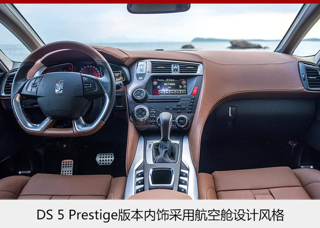 DS 5 Prestige版本车型内饰采用航空舱设计风格,三片式全景天窗想象力和未来感十足。中控台采用大量皮质包裹,靠近方向盘一侧还配有时钟装饰,真皮座椅依然使用表链式设计,使得新车豪华感十足。