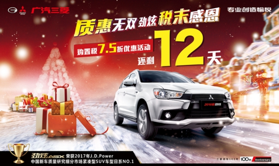 值得一提的是,劲炫除了拥有媲美实力演员的专业功底外,性价比更是无可比拟。正值年终重磅回馈之际,广汽三菱劲炫“税末感恩”六重钜惠大放送,购买劲炫即可享受价值2万元豪礼,包括:1.6L车型购置税减半、5年15次免费常规保养、2年0息定额贷、置换劲炫可达6000元补贴、亲子礼以及购车幸运礼。其中,购置税减半优惠政策已进入倒计时,欲享从速,实力派劲炫正期待与你演绎精彩的SUV生活。