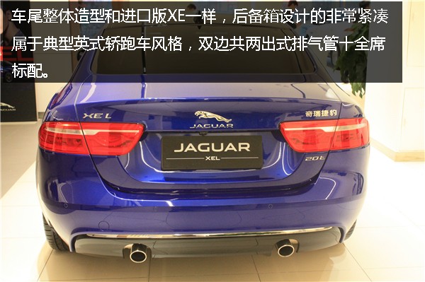 从新车尾部来看,车尾的整体造型与进口版的XE车型基本保持一致,仅在后保险杠上增加了一条镀铬装饰,以及在右侧加入了“奇瑞捷豹”的LOGO来增强新车的辨识度。