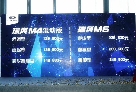 12月16日,中国首款混合动力MPV——江淮瑞风M4HB混合动力车型和私享定制级MPV——瑞风M6在举行了河南省首发上市发布会。发布会现场公布了瑞风M4的价格:售价12.98万元-14.98万元。瑞风M4混动版采用高效的1.5TGDI直喷增压汽油机+Hyboost混合动力系统,令这款长达5.2米的MPV油耗可低达7.4升/百公里,成为大中型MPV市场上最为经济和环保的选择。瑞风M6售价23.95万-34.95万,以“私享定制”的产品定位诠释瑞风“MPV制造专家”的品牌精髓,也为江淮品牌持续向上突破提供新的动力源泉。