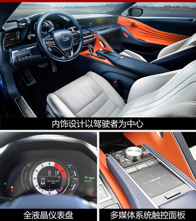 全新LC系列跑车内饰采用大量皮质覆盖,并配以缝线处理,豪华感营造的十分出色。全液晶仪表盘显示信息可自由组合调整,三辐式真皮方向盘采用打孔处理。中控台中央配有大尺寸液晶显示屏,同时还为多媒体系统提供旋钮、按键、触控面板等多种操作方式。此外,新车两侧座椅中央配有隔板及扶手,并提供换挡拨片,符合其跑车身份。