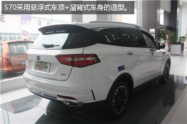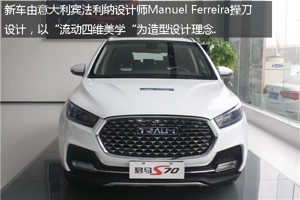 在外观上君马S70由意大利宾法利纳设计师Manuel Ferreira操刀设计,以“流动四维美学“为造型设计理念,S70偏向轿跑车的设计风格也是它区别于众多竞争对手的显要特征。君马S70采用悬浮式车顶+溜背式车身的造型,六边形的“大嘴”格栅也是时下比较流