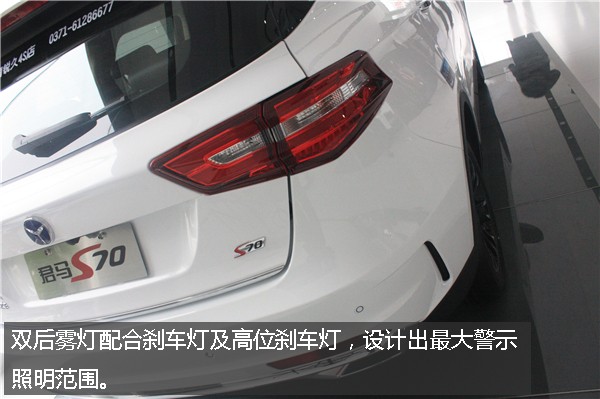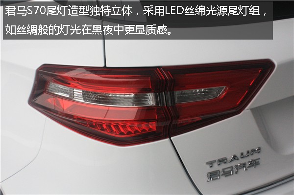车尾造型非常简洁,几根横向线条让整体视觉上看起来更紧凑。君马S70尾灯造型独特立体,采用LED丝绵光源尾灯组,如丝绸般的灯光在黑夜中更显质感,也是一般豪华车常见的设计。双后雾灯配合刹车灯及高位刹车灯,设计出最大警示照明范围,使后方车辆能在更远的距离发现本车。排气为隐藏式设计,而后包围底部还是设计了类似于排气孔的装饰。