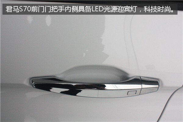 侧面来看,君马S70多采用平直线条勾勒,一条上扬的腰线贯穿前后车门把手,并且与尾灯组相连,加上目前流行的悬浮式车型设计,使整车看起来比较具有力量感。值得一提的是,君马S70前门门把手内侧具备LED光源迎宾灯,科技时尚,在夜间使用时不仅实用且更显档次。君马S70车身长宽高分别为4746mm、1882mm、1700mm,轴距达到2800mm,与市场主流产品基本相同。