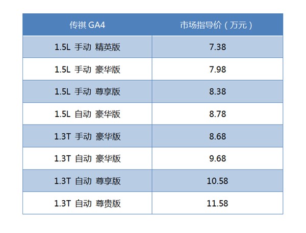 2018年1月28日,广汽传祺GA4在郑州正式上市,售价区间为7.38-11.58万元。新车是广汽传祺旗下全新紧凑型车,采用家族式设计语言,整体造型年轻且富有冲击力,内饰方面层次分明,极具豪华感。动力总成上搭载1.3T及1.5L发动机,匹配5速手动以及6速手自一体变速箱。