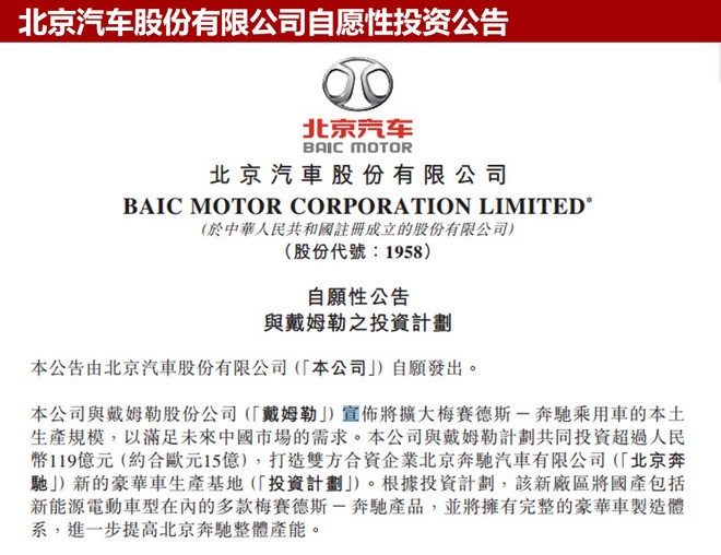 2月25日,北京汽车股份有限公司与戴姆勒股份公司宣布将扩大梅赛德斯-奔驰乘用车的本土生产规模,计划共同投资超过人民币119亿元,打造双方合资企业——北京奔驰新的豪华车生产基地。从北汽集团公告获悉:该新厂区将国产包括新能源电动车型在内的多款梅赛德斯-奔驰产品,并将拥有完整的豪华车制造体系,进一步提高北京奔驰整体产能。