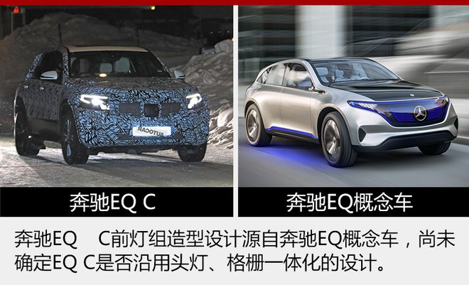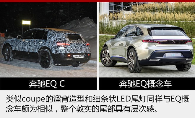 从谍照来看,不同于奔驰现在家族化的外观,奔驰EQ C有着全新的设计。前灯组的造型显然脱胎自奔驰EQ概念车,在点亮状态下EQ C像是呈现了一个严肃的表情。由于进行了伪装,目前还未能确定EQ C是否沿用EQ概念车的头灯、格栅一体化的设计。类似coupe的溜背造型和细条状LED尾灯同样与EQ概念车颇为相似,整个敦实的尾部具有层次感。