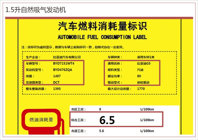 从国家工信部公布的信息可知,比亚迪新款G5将增搭一台型号为BYD476ZQA 1.5升自然吸气发动机,额定功率80千瓦;传动系统方面,匹配DCT双离合变速箱。此外,新车百公里综合油耗为6.5升。