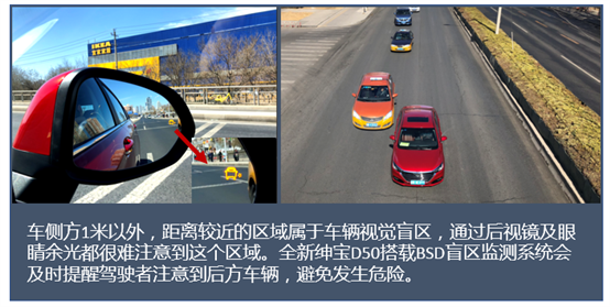 大多数开车的人都有过这样的经历,当看后视镜的时候并没有发现车辆后方有车辆,而打开转向灯正要变道的时候突然穿出一辆汽车,如果驾驶员这时候并道,极有可能跟后方来车发生碰撞。全新绅宝D50盲区监测很好的解决了这一安全隐患,在车速30-140km/h时,对后方3-6米进行实时监测。