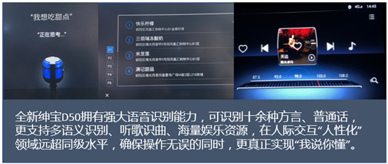 人工智能AlphaGo“打遍天下无敌手”,全新绅宝D50的智商也有同级无敌之势。它的智能语音系统,可以直接识别行车中的大多数自然语句,犹如有了行车秘书一般。你可以直接说:“我饿了、我要吃甜点、我明天要不要带伞”等日常语句,全新绅宝D50就可以分别给你“推荐餐厅、甜品店或显示天气”等思考后的操作。甚至广播中听到一首歌非常好听,不知道这首歌叫什么,你只需要说一句:这是什么歌?全新绅宝D50就能自动识别并告诉你歌的名字和演唱者。