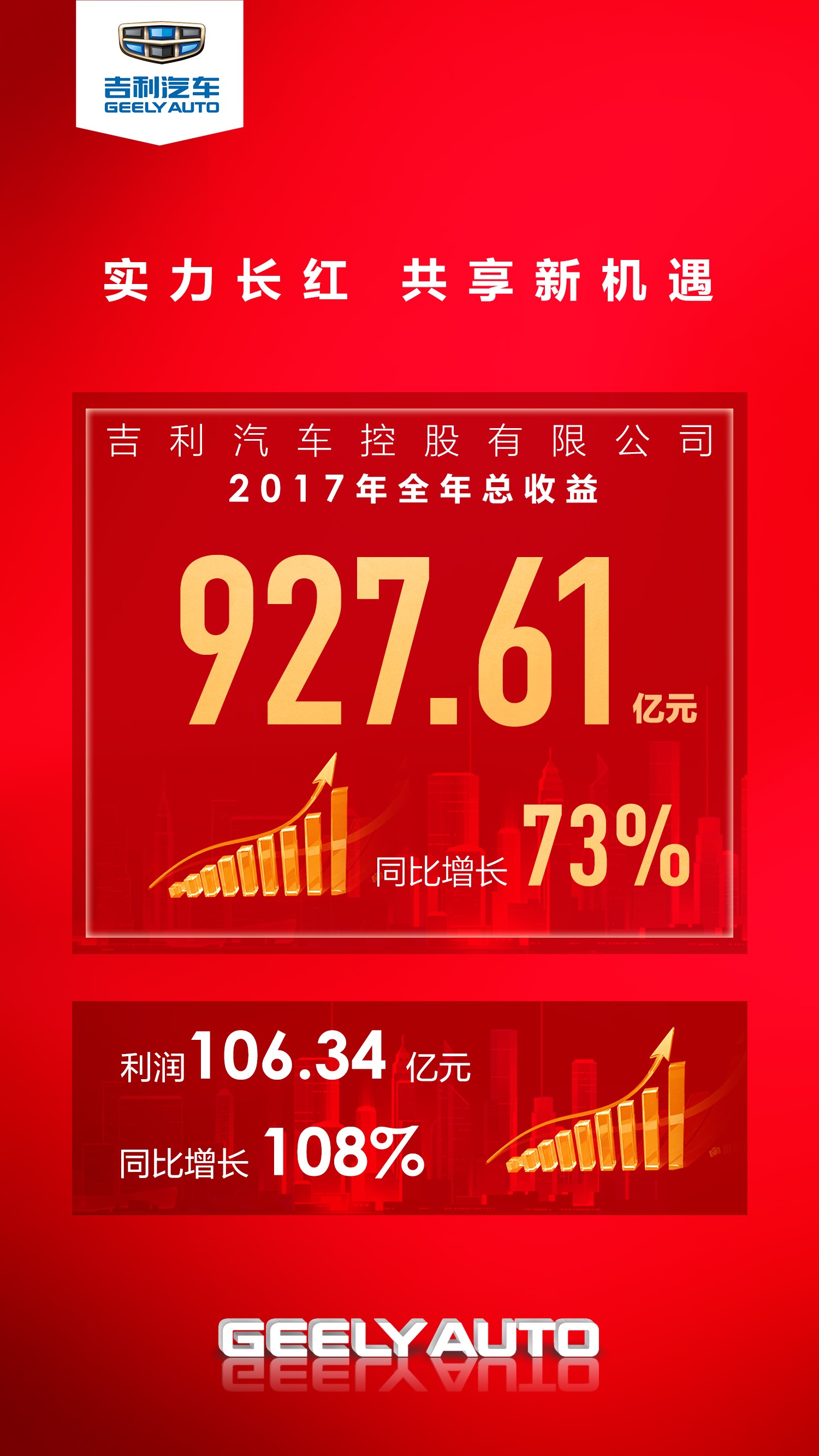 【中国香港,2018年3月21日】3月21日,吉利汽车控股有限公司(简称“吉利汽车”)(HK.0175)发布2017年财报。数据显示,2017财年的财务表现超过预期,全年总收益增加73%至927.61亿人民币,实现利润达到106.34亿元人民币,增长超过108%。喜人业绩背后是吉利从高速增长向高质量发展的不断迈进。