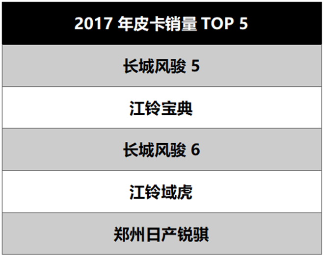其实,尽管皮卡一直被区别对待,但因为需求长期存在,国内皮卡市场一直在低调进化。抛开皮卡的行业性需求,家用需求也在随着消费升级、自驾出游等生活方式的改变逐渐露出苗头。从2017年销量排名里,我们也能大概看出皮卡市场的发展趋势。